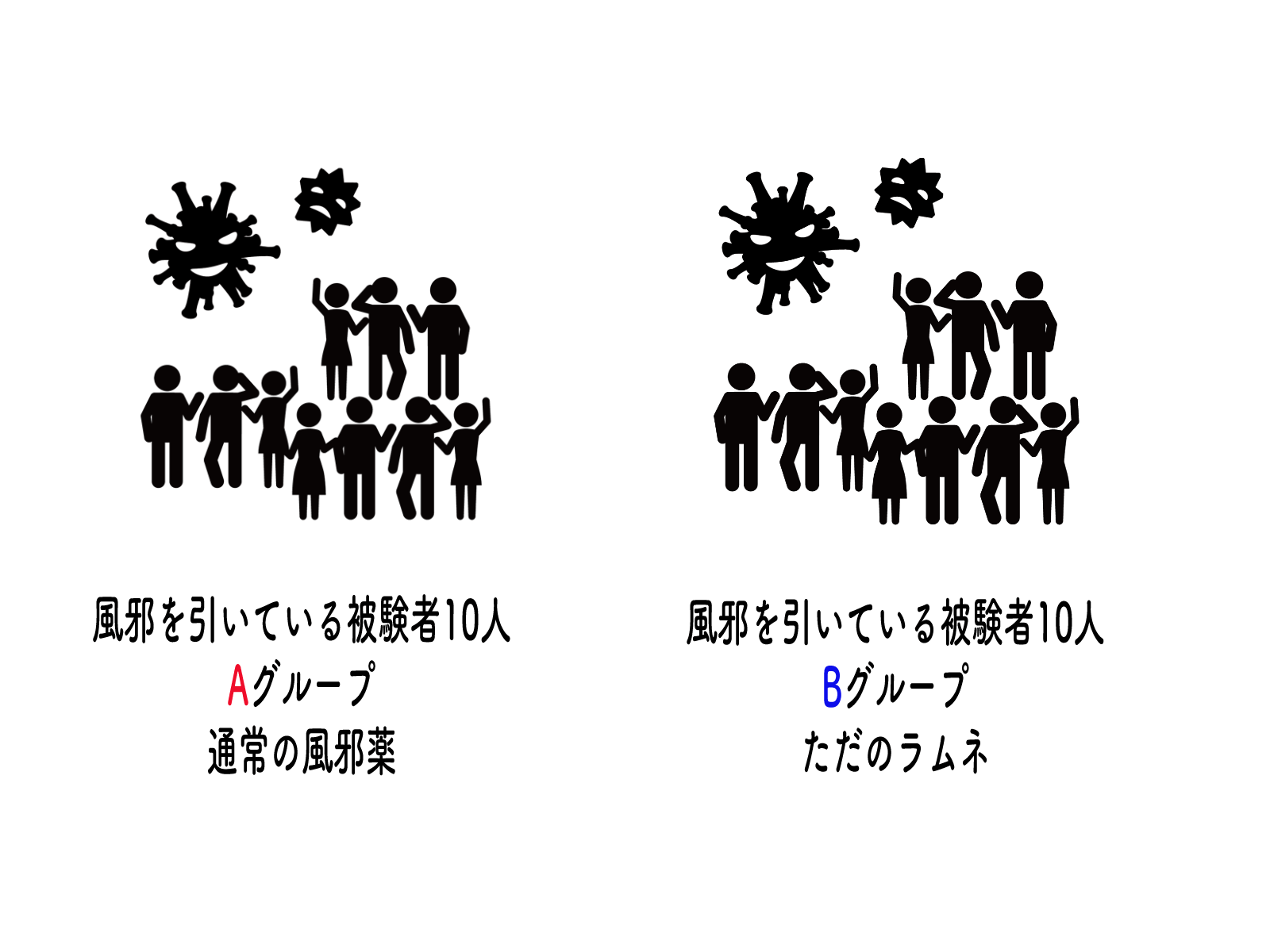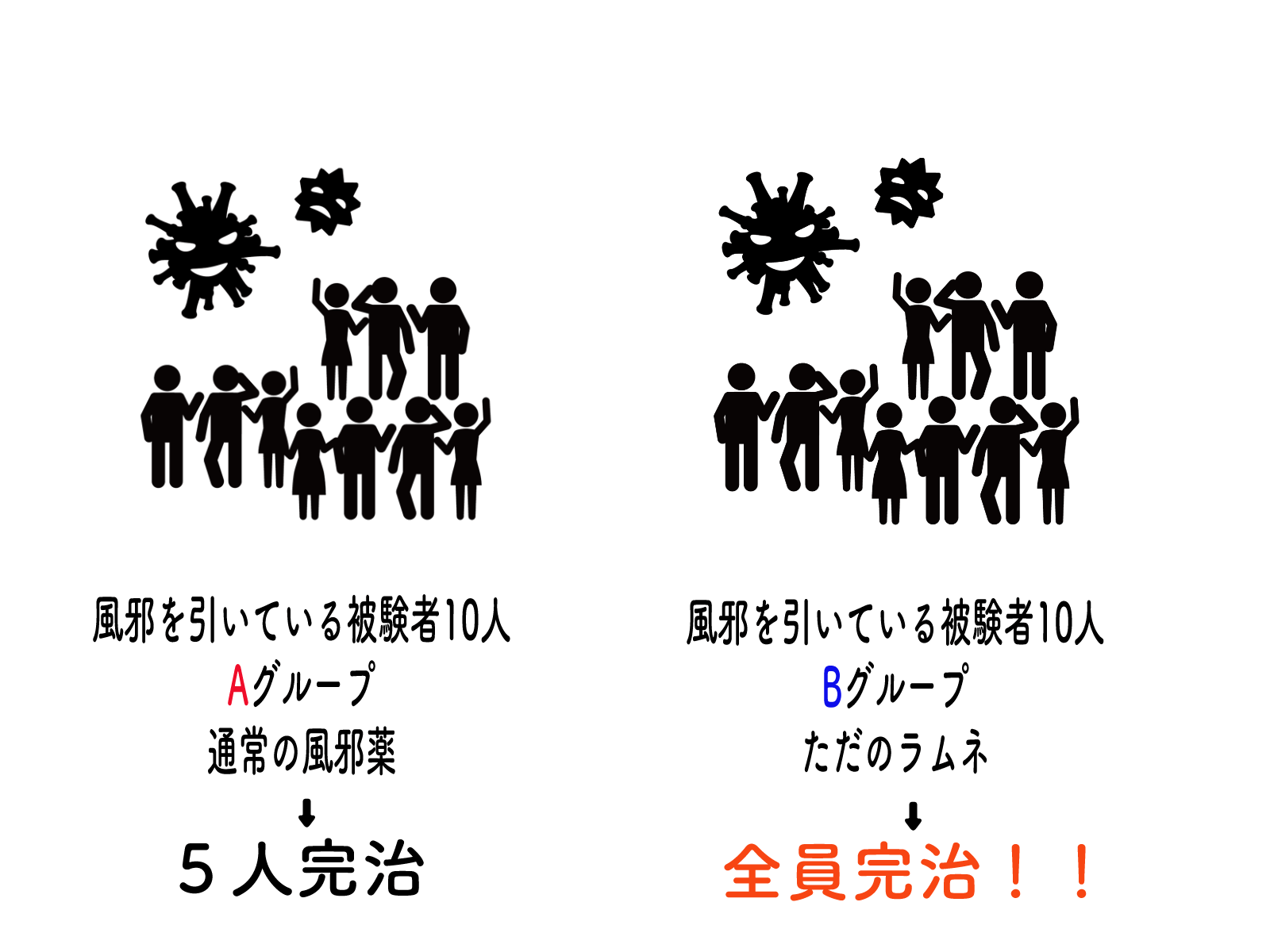 集団Aには通常の風邪薬を与え、Bには「これは画期的な新薬です」と言ってただのラムネを与えました。